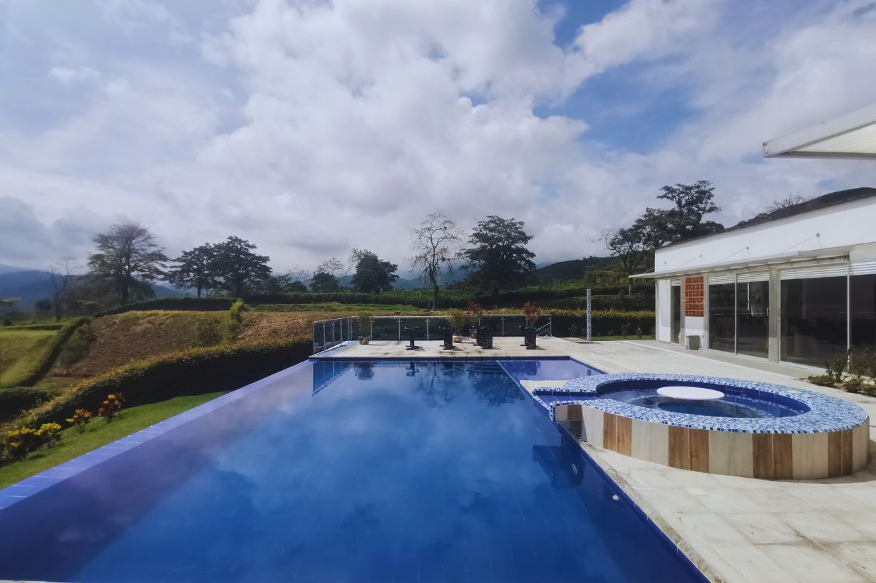 Proyecto de vivienda campestre que se eleva en su estructura robusta en medio de una ladera de alta pendiente. Esta vivienda comprende la necesidad de abrirse al atardecer de las montañas y conectar su programa hacia el paisaje cafetero.